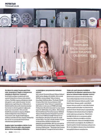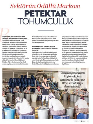 “Şirketi kurmadan önce kendi imkanlarımla tohum üzerine Ar-Ge çalışmaları yürüttüm. Uzun yıllar süren çalışmalarımın karşılığı olarak şirketim Petektar Tohum 2010 yılında resmi olarak açıldı. İlk kurulduğumuz yıllarda 2 kişi olarak çıkmış olduğumuz bu yolda bugün 110’un üzerinde kişiyle devam ediyoruz. Çalışanlarımızın %90’ını kadınlar oluşturuyor. Antalya’da 40 dönüm alanda kurulan şirketim Petektar Tohum 2016 yılı itibariyle 127 dönüme ulaştı. Bugünki başarılarımızın ve Petektar Tohum’un bu gün geldiği noktanın temelinde yatan gerçek ise, bu işe işçi olarak başlamam ve mühendis olarak devam etmemdir. Üretimin her aşamasını yakından takip edip Ar-Ge çalışmalarının gidişatını bizzat kendim takip ediyorum. Çalışanlarımla sürekli bir diyalog halinde olduğum için yapılan hataları minimize edebiliyorum ve anında müdahale edebiliyorum. Sadece bir yönetici değil aynı zamanda şirketimin bir çalışanıyım diyebilirim.”