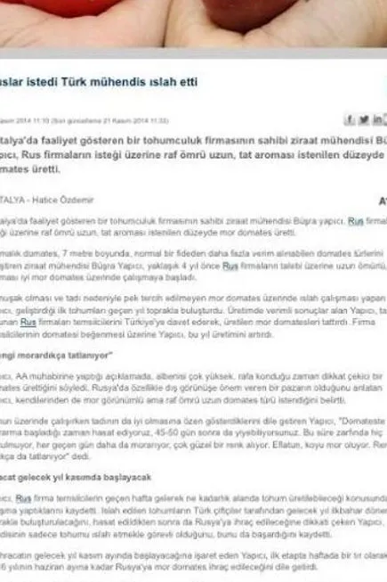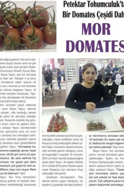 Ruslar istedi Türk mühendis Büşra YAPICI ıslah etti, Antalya’da faaliyet gösteren tohumculuk firmasının sahibi ziraat mühendisi Büşra Yapıcı, Rus firmaların isteği üzerine raf ömrü uzun, tat aroması istenilen düzeyde mor domates üretti.